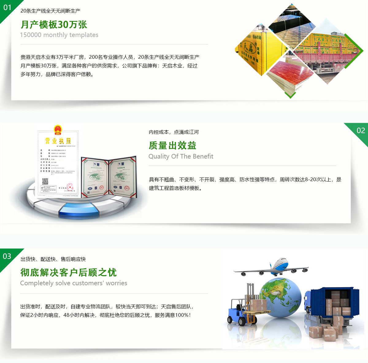 天啟木業(yè)主營:建筑木模板、膠合板、覆膜板、清水建筑模板、橋梁建筑模板、優(yōu)質(zhì)高端建筑模板。產(chǎn)品質(zhì)量倍受認可,贏得了眾多客戶的一致好評。天啟人愿廣交天下朋友,精誠合作,互惠互利,共創(chuàng)美好未來。咨詢電話:13669498777